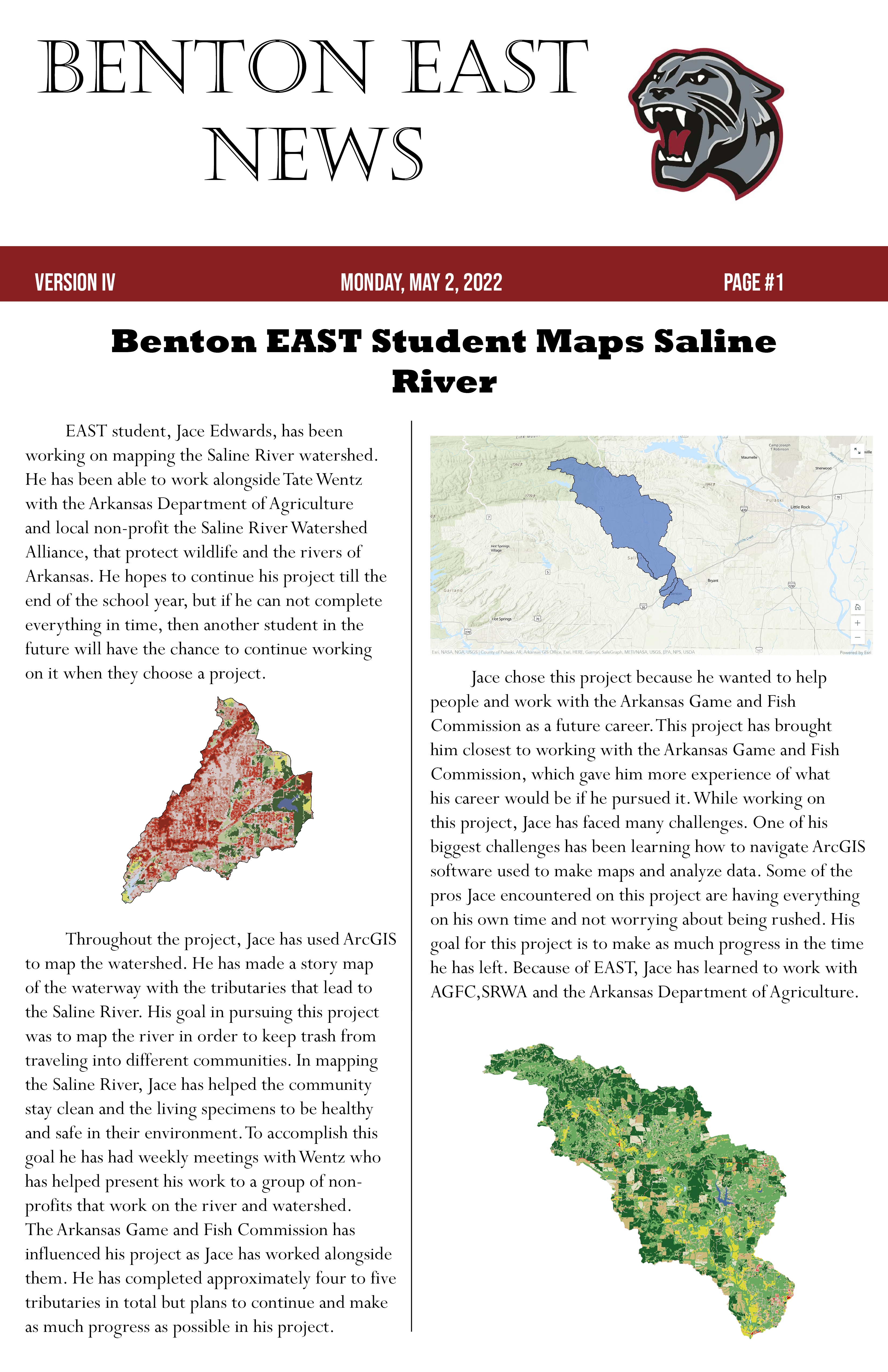 Benton High School EAST student, Jace Edwards, has been working on mapping the Saline River watershed. He has been able to work alongside Tate Wentz with the Arkansas Department of Agriculture and local non-profit the Saline River Watershed Alliance, that protect wildlife and the rivers of Arkansas. He hopes to continue his project till the end of the school year, but if he can not complete everything in time, then another student in the future will have the chance to continue working on it when they choose a project.